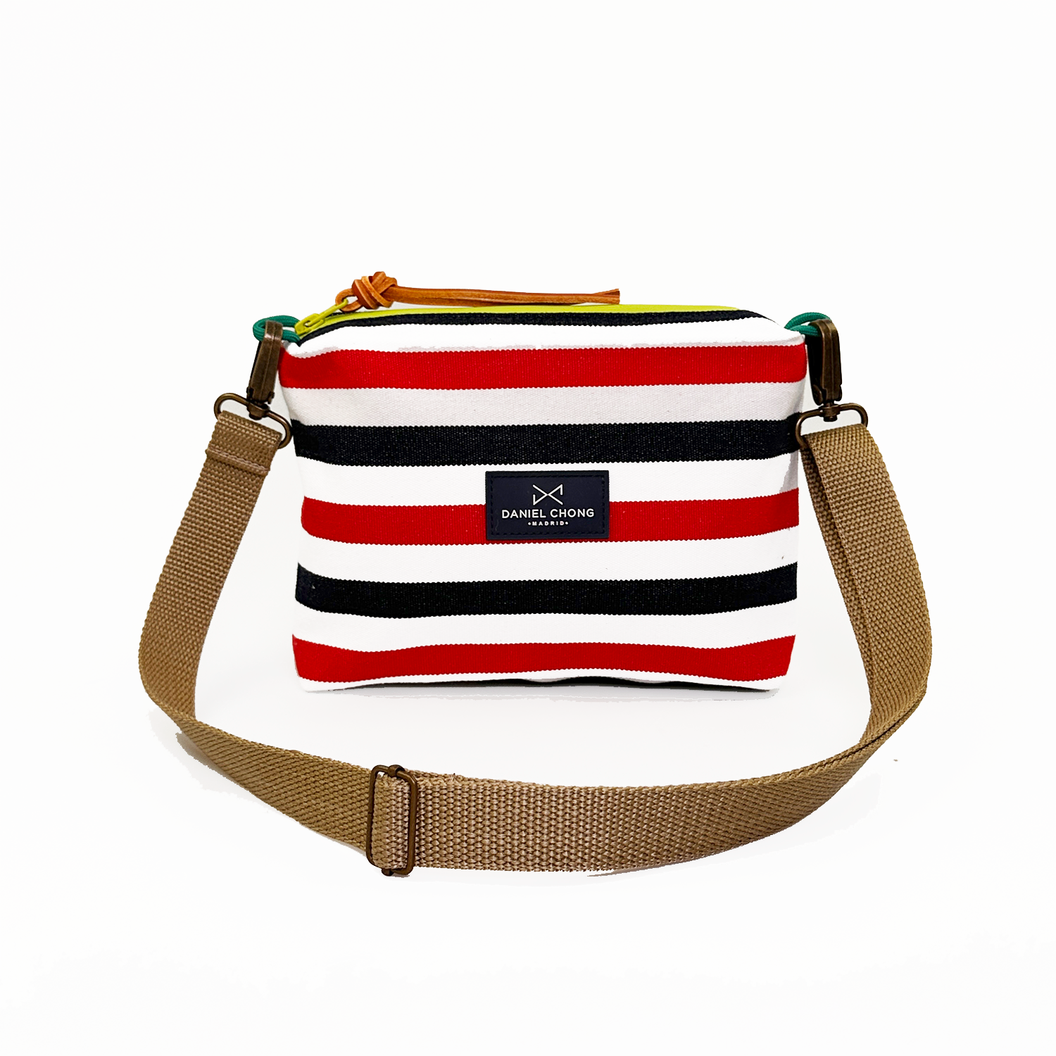 BANDOLERA MINI LONA RÚSTICA RAYAS ROJAS Y AZULES, ZIP VERDE FLÚOR
