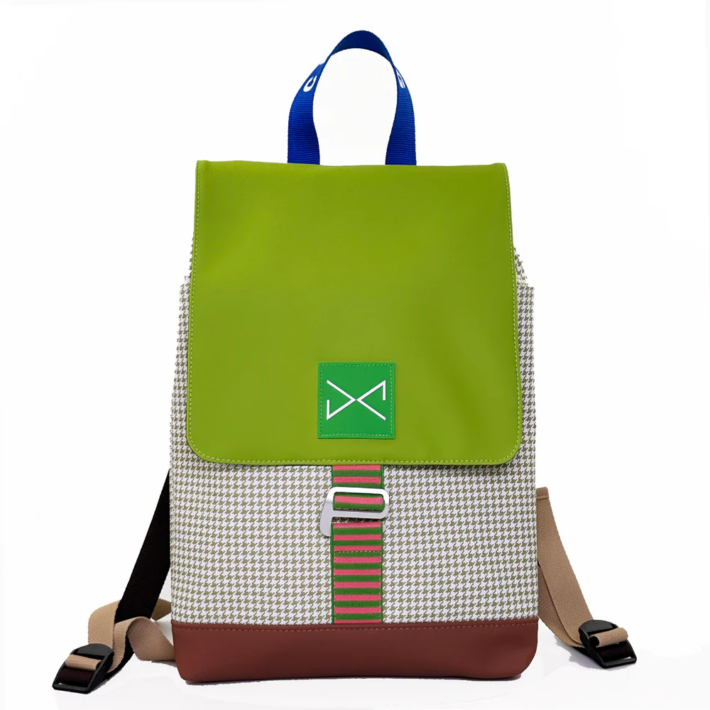 Su solapa de cierre con gancho no solo realza el estilo, sino que también garantiza practicidad y resistencia. Además, está confeccionada con materiales procedentes de botellas recicladas, reafirmando el compromiso con la sostenibilidad sin renunciar al diseño.